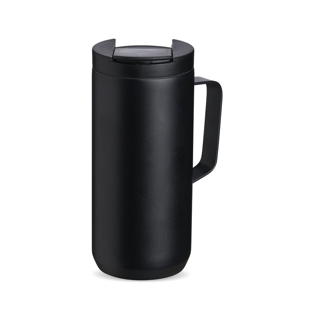 Caneca térmica de inox em parede dupla livre de BPA, capacidade de 350ml. Contém base antiderrapante e tampa plástica com bocal e trava de segurança.