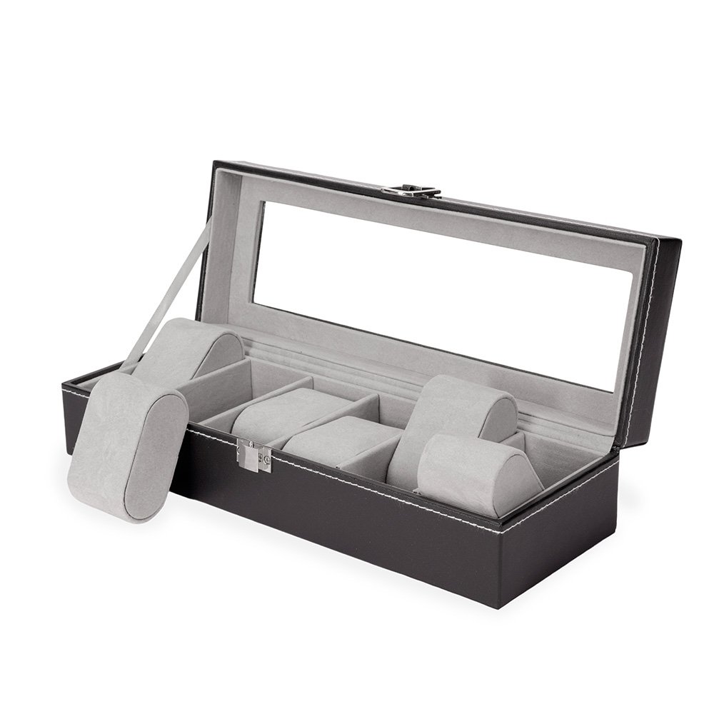 O visor de vidro na tampa permite visualizar os relógios sem precisar abrir o estojo, e a trava de segurança assegura proteção extra. Um item elegante, ideal para uso pessoal ou como presente sofisticado e funcional.